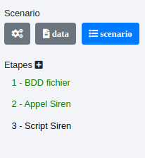 Nous aurons besoin d’insérer ce court scénario dans un autre plus conséquent alors pourquoi ne pas le taguer "Scénario Siren"? Il commence à l’étape 1 et se termine à la 3. Dans un autre cas, nous avons besoin d’appeler cette même base de données avec le même paramétrage. Nous pouvons donc taguer seulement l’étape 1 "Appel BDD fichier". Troisième cas, nous avons un traitement avec d’autres numéros SIREN dans une colonne au nom identique. Nous avons déjà l’appel au service et le script de traitement des réponses json. Il nous suffit alors d’appeler le tag "Siren + script" dans le scénario.
