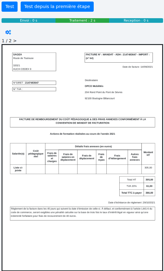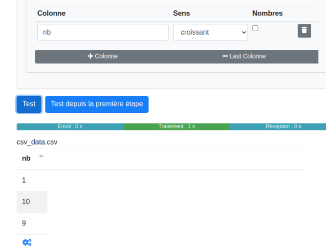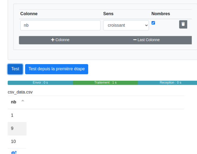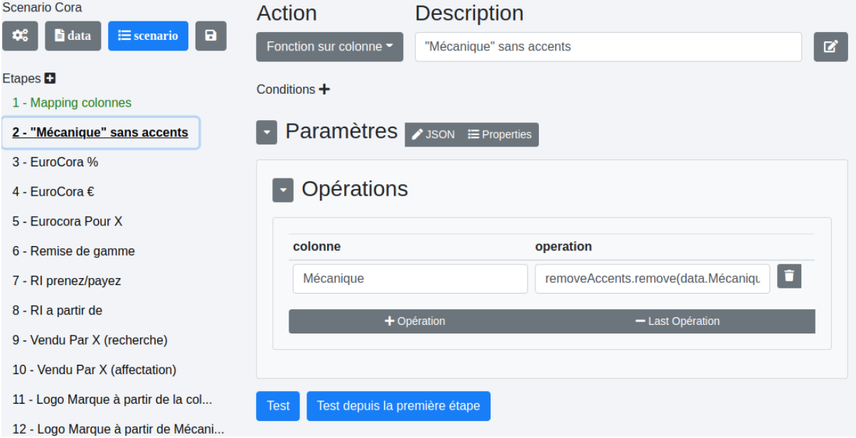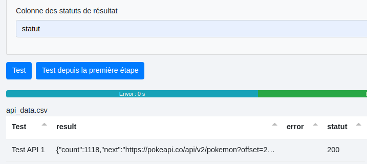 Le bouton "test depuis la première étape" relance le scénario complet. C’est utile notamment lorsque les données initiales ont changé (nouveau fichier test) ou lorsqu’une étape précédente a été modifiée.