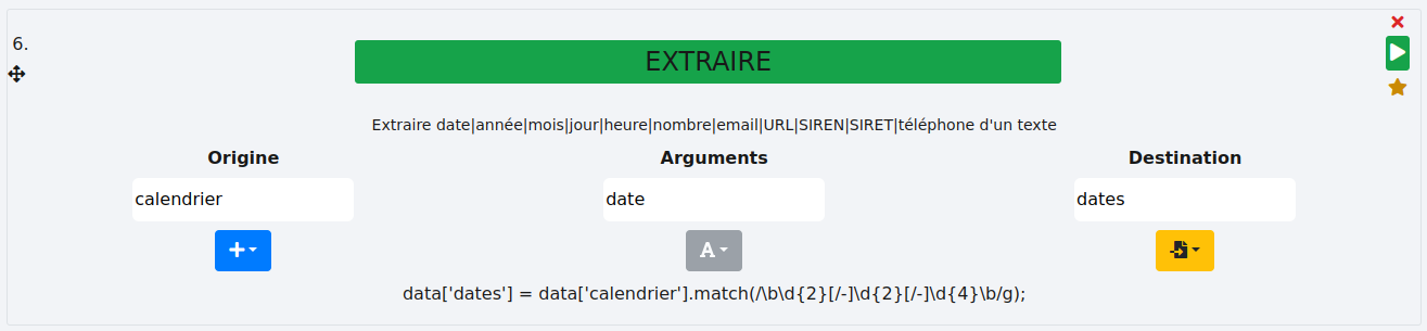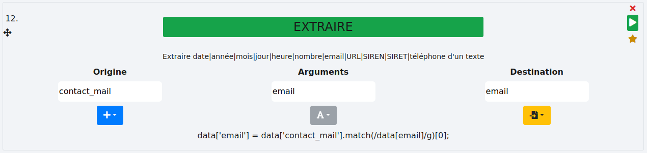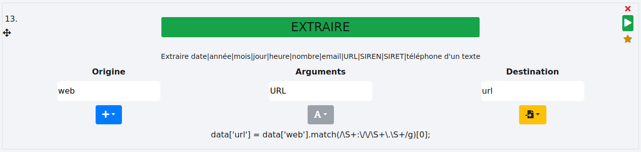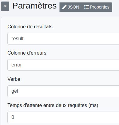 Cette étape permet d’effectuer des requêtes API. Les paramètres par défaut précisent les colonnes de résultats et d’erreurs, l’action à entreprendre (GET, POST, etc) et le temps d’attente entre deux requêtes (dépendant de l’API).