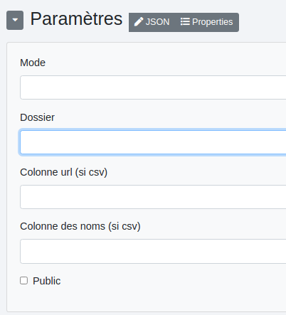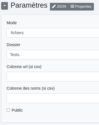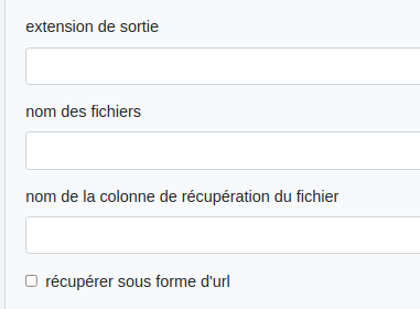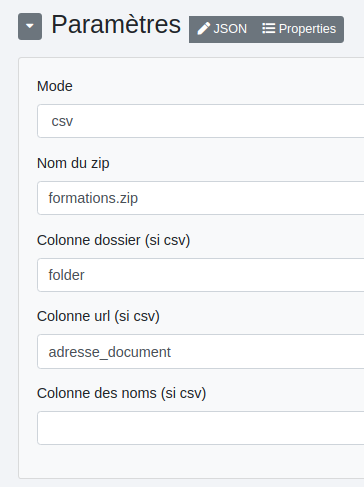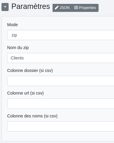 Nom du zip : nom du fichier zip. Colonne dossier (si csv) : colonne des noms de dossiers (les chemins d’accès des fichiers) avec un fichier csv en entrée. Colonne url (si csv): colonne des url des fichiers avec un fichier csv en entrée. Colonne des noms (si csv) : colonne des noms de fichiers avec un fichier csv en entrée.