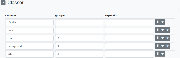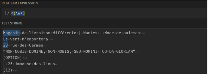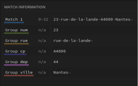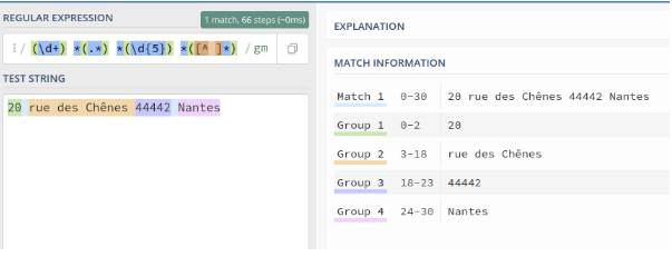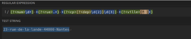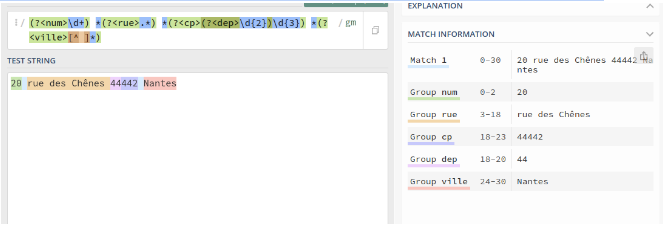 Tous les éléments d'une adresse : numéro, rue, cp et ville : (?<num>\d+) *(?<rue>.*) *(?<cp>(?<dep>\d{2})\d{3}) *(?<ville>[^ ]*) Ici, les expressions sont récupérées par groupes classés par leurs noms.