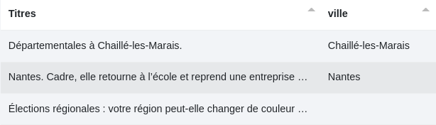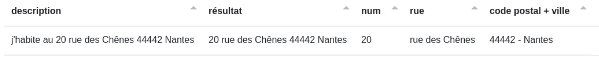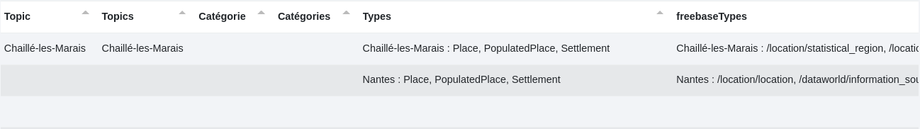 Nous avons 6 nouvelles colonnes correspondant aux cases précédemment cochées. Sur ces trois lignes, seules les deux premières comportent une ville que nous souhaitons extraire dans une colonne à part. Dans "Types", nous pouvons remarquer qu’elles ont toutes deux les types "Place" et "PopulatedPlace".
