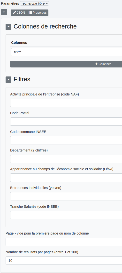 2 - Il est également possible d’effectuer des recherches par filtres de la même manière que pour le mode Siren mais en se basant cette fois sur le json type des établissements.