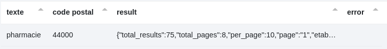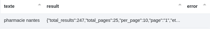 L’objectif est ici de rechercher des entreprises par d’autres moyens que les numéros SIREN ou SIRET comme l’adresse, le code postal, la raison sociale, etc. Si je veux rechercher les pharmacies nantaises par exemple, je vais entrer ceci :