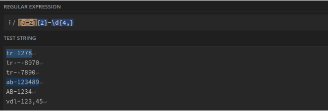 Deux lettres minuscules suivies d'un "-" puis d'un nombre de 4 chiffres minimum. Ex : tr-1234 : [a-z]{2}-\d{4,}