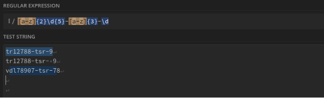 Deux minuscules suivies de 5 chiffres, d'un tiret, de trois minuscules, d'un tiret et d'un chiffre. Ex : tr12234-ret-1 : [a-z]{2}\d{5}-[a-z]{3}-\d