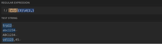 Trois lettres minuscules suivies d'un nombre de deux chiffres minimum. Ex : trp12 : [a-z]{3}\d{2,}