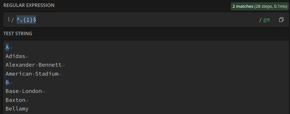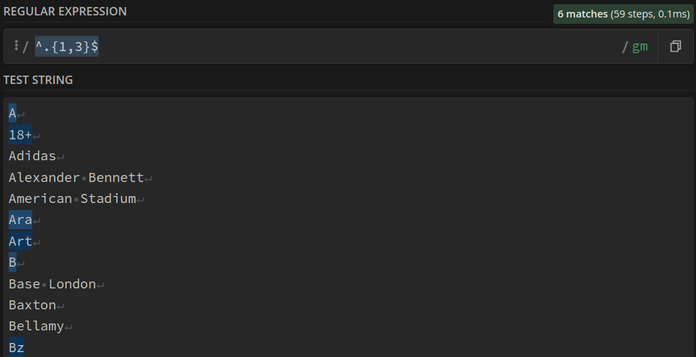 Les expressions ne contenant qu’une seule lettre : ^.{1}$