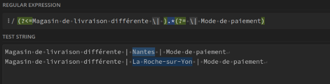 Tout se qui est entre les deux bornes, ici les expressions "Magasin de livraison différente | " et " | Mode de paiement : (?<=Magasin de livraison différente \| ).*(?= \| Mode de paiement)