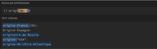 Tous les caractères alphanumériques et les espaces après "origi" jusqu’à la fin de ligne ou rencontrer un caractère non alphanumérique (ponctuation par ex) : origi[\w| ]*