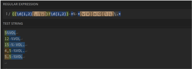 Degré d'alcool : ((\d{1,2}[,|.])?\d{1,2}) *% *[v|V][o|O][l|L].*