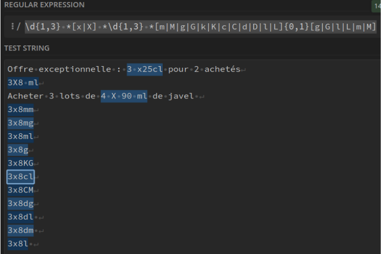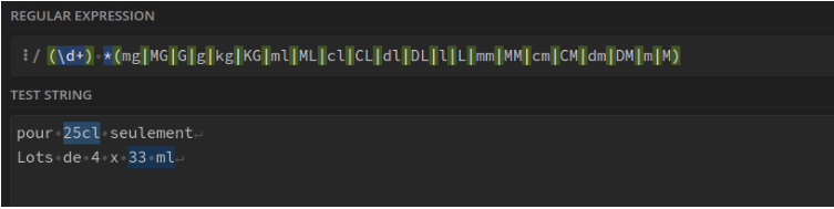 Lots. Ex : 6 x 25 cl : \d{1,3} *[x|X] *\d{1,3} *[m|M|g|G|k|K|c|C|d|D|l|L]{0,1}[g|G|l|L|m|M]