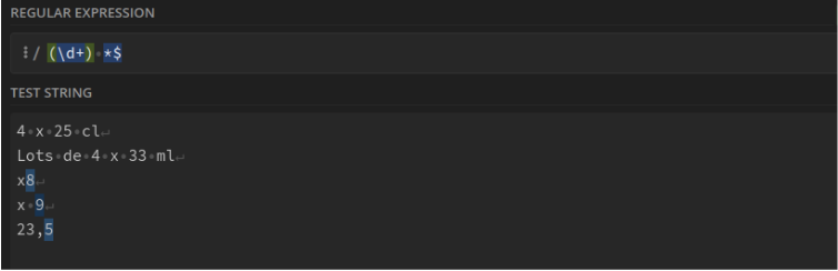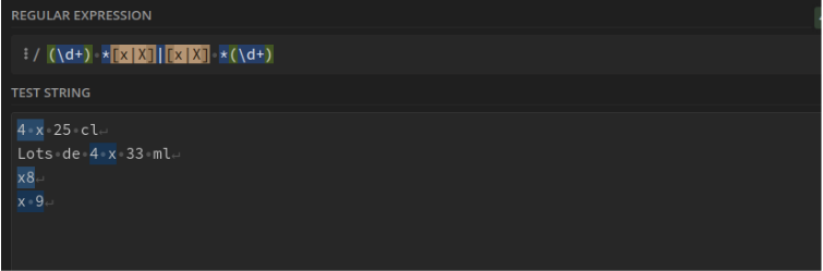 Nombre suivi ou précédé d'un "x" dans une expression de lot. Ex : "6 x 25 cl" renvoie "6 x" et "x7" renvoie "x7" : (\d+) *[x|X]|[x|X] *(\d+)