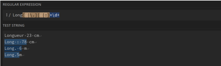 “Long” avec nombre entier. Le point, l'espace et les deux points entre eux sont optionnels : Long[ |\.][ |:]*\d+