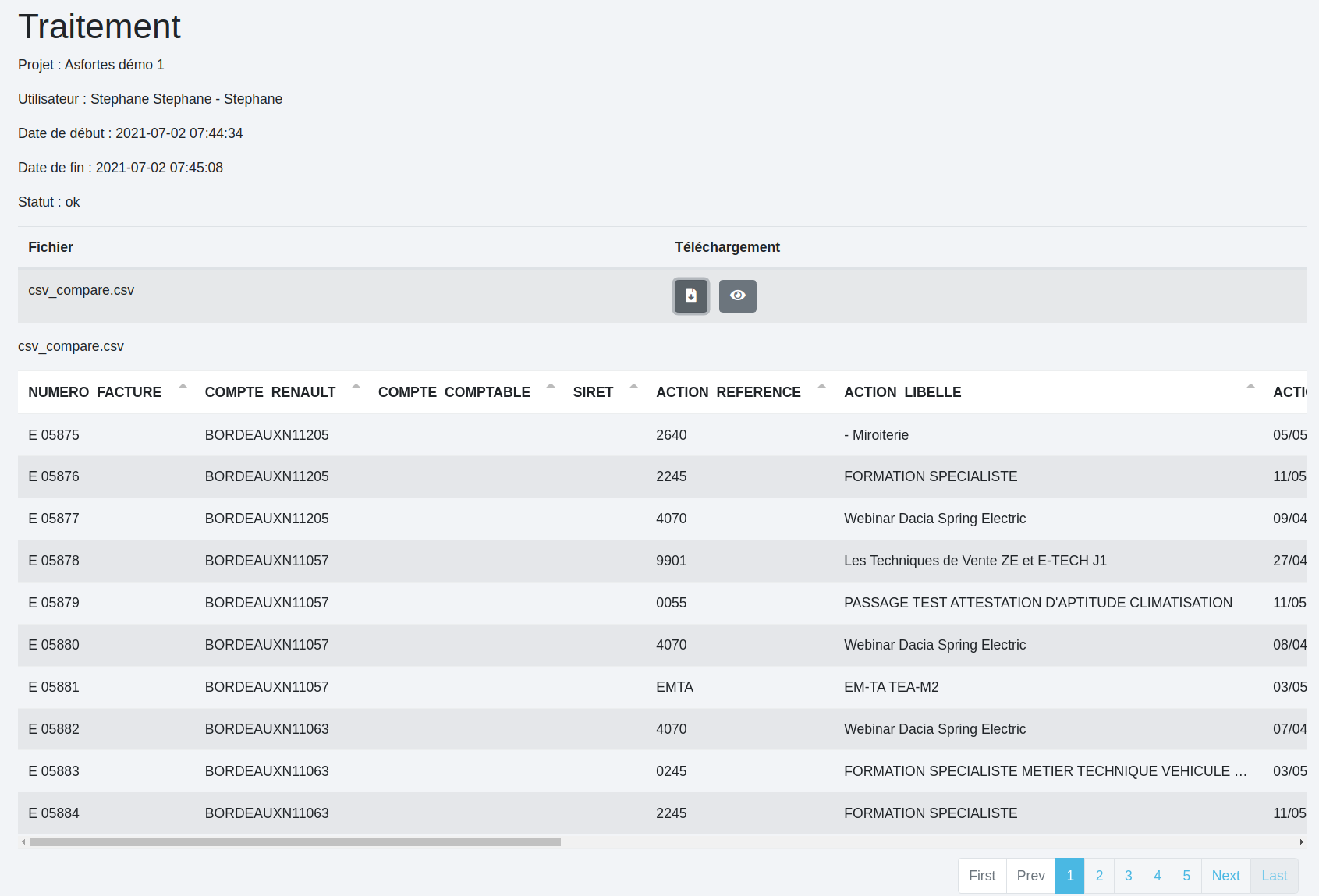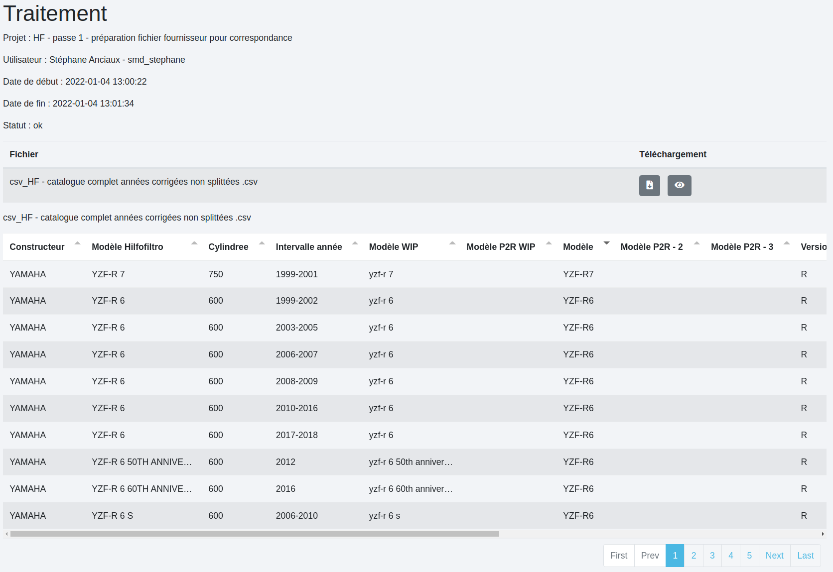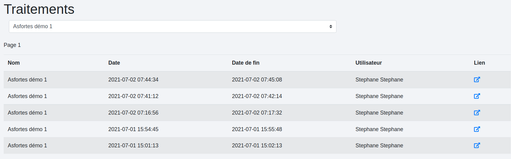 Il s’agit ici de retrouver tous les traitements réalisés pour un même projet ainsi que leurs fichiers de sortie. Choisir le projet dans le menu déroulant fait apparaître toutes les exécutions réalisées avec les dates et heures de début et de fin de traitement et l’utilisateur.